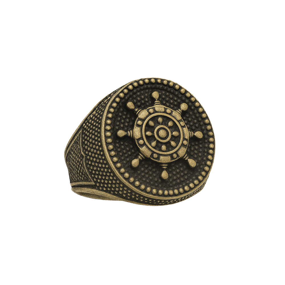 Yüzüğün merkezinde, tüm ihtişamıyla bir “gemi dümeni” yer alır. Bu evrensel sembol, sadece denizi ve yolculuğu değil; aynı zamanda kararlılığı, kişinin kendi hayatının direksiyonunda olma iradesini ve zorluklar karşısında doğru rotayı bulma yeteneğini simgeler. Bu yüzüğü taşımak, “Kontrol bende” demenin sessiz ama en güçlü yoludur.