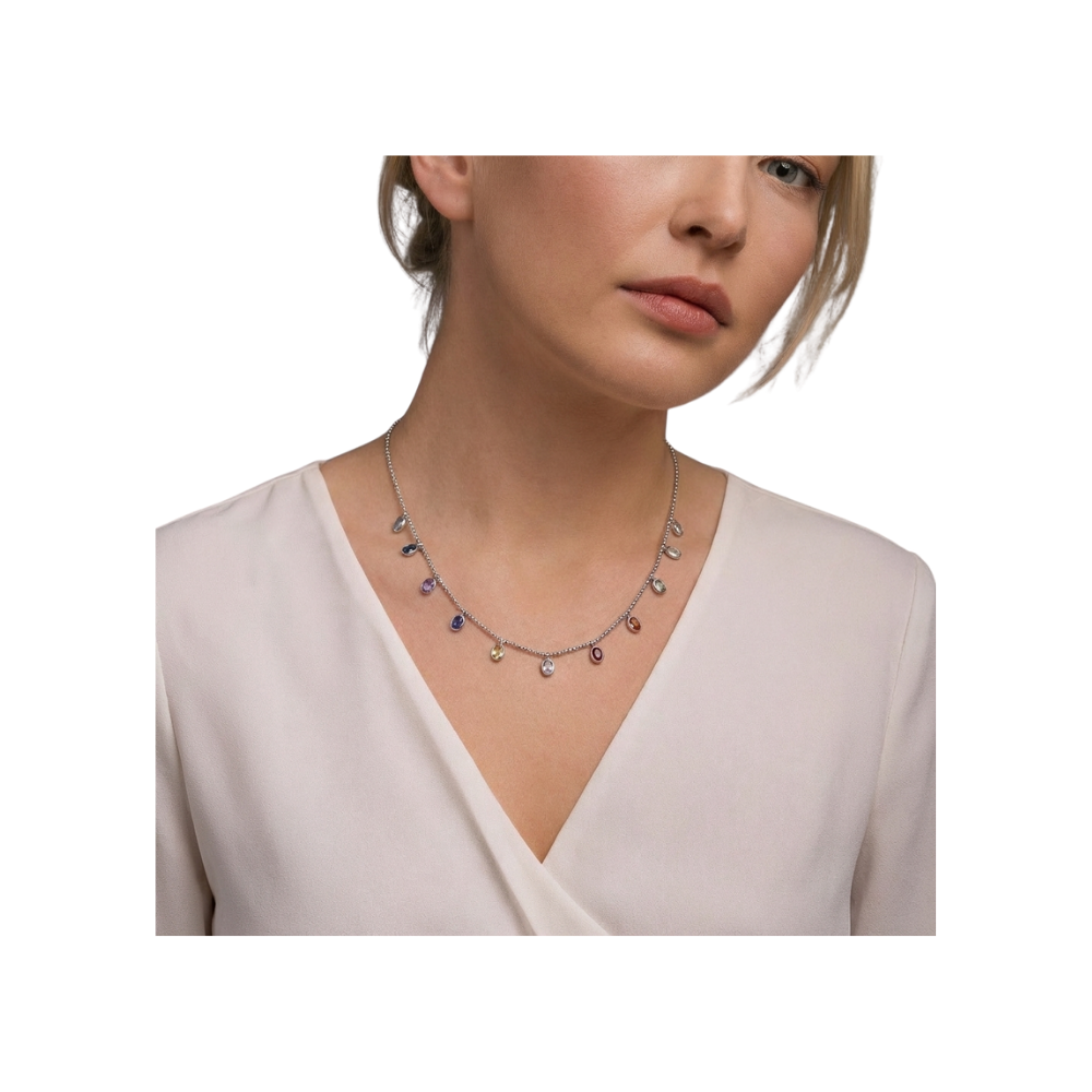 Kolyenin üzerinde narin bir şekilde sıralanan taşlar, adeta bir gökkuşağının yeryüzündeki yansımasıdır. Ametistten sitrine, topaza kadar uzanan bu geniş renk yelpazesi, sadece estetik bir şölen sunmakla kalmaz; her bir taşın kendine has enerjisini stilinize taşır. “Shakira” tasarımının özelliği olan sallantılı yapı sayesinde, siz hareket ettikçe taşlar da sizinle birlikte dans eder ve ışığı her açıdan yakalayarak yüzünüze doğal bir aydınlık katar.