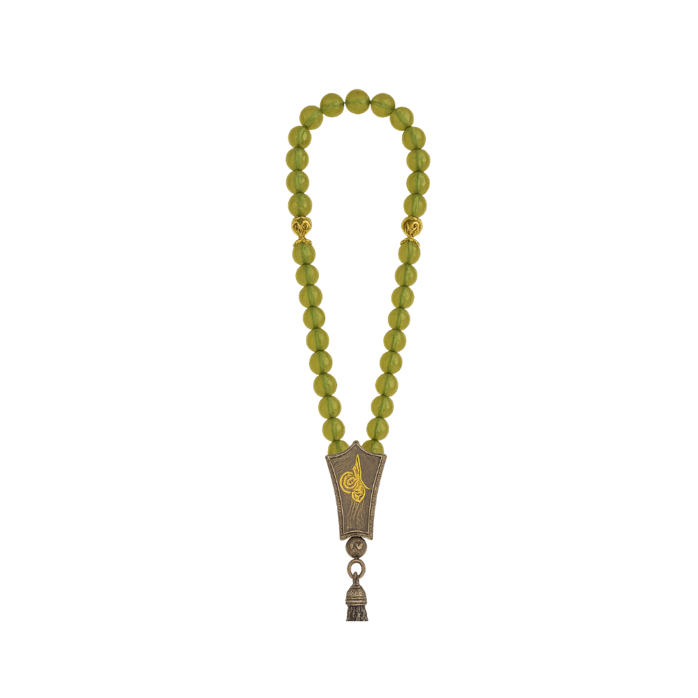 Bu Tuğra, sadece bir dekorasyon değil; gücün, asaletin ve köklü bir mirasın sembolüdür. İmamenin ve tesbihin durak (ayıraç) tanelerinin tamamı, “antik bronz/oksitli eskitme” tekniğiyle kaplanmıştır. Bu eskitme doku, Zultanit’in yeşil ve sarı tonlarıyla mükemmel bir uyum yakalar ve tesbihe adeta bir “saray hazinesinden” çıkmış gibi tarihi ve asil bir hava katar.