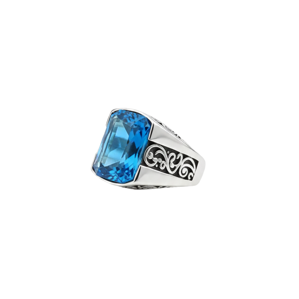 Özel Kesim Mavi Zirkon: Dikdörtgen formunda, derin fasetli kesimiyle pırlanta ateşi yaratan büyük mavi taş, yüzüğün asil merkezini oluşturur.