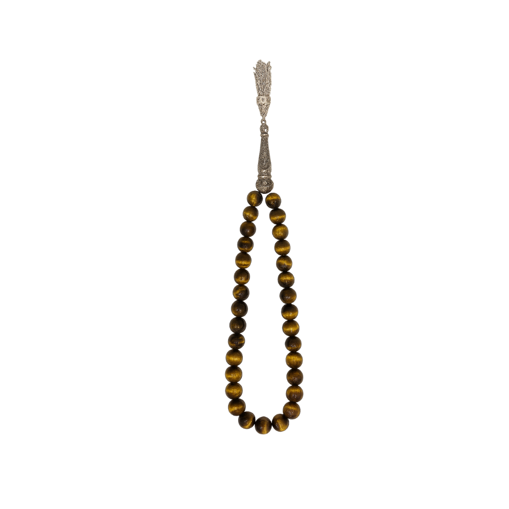 Bu tesbihin en büyüleyici özelliği, “chatoyancy” olarak bilinen ipeksi ışıltısıdır. Işıkta hareket ettikçe, tanelerin üzerindeki altın-kahve tonlarındaki hareler adeta canlanır ve dans eder. Bu doğal optik oyun, her bir taneyi benzersiz ve hipnotize edici kılar. Pürüzsüz “küre kesim” taneler, bu ışıltıyı maksimum düzeyde yansıtarak tesbihin çekim keyfini zirveye taşır.