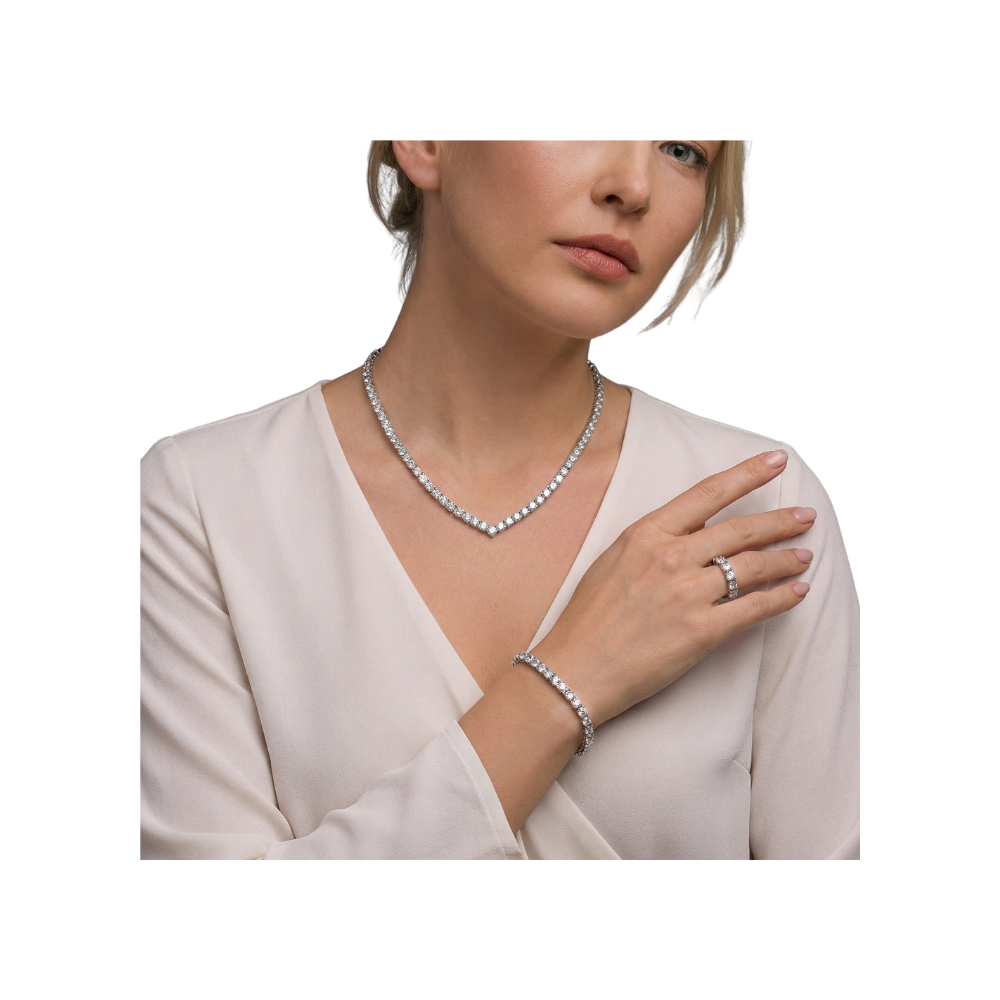 Setin kalbi olan kolye, boyun hattını zarifçe vurgulayan “V” formuyla tasarlanmıştır. Bu form, özellikle V yaka ve kalp yaka gelinliklerle kusursuz bir uyum sağlar. “Su yolu” tasarımı, taşların kesintisiz bir nehir gibi birbirini takip etmesiyle oluşur; bu da kolyeye, bilekliğe ve yüzüğe modern olduğu kadar klasik bir asalet katar. Her bir taş, pırlanta montür tekniğiyle tırnaklı olarak mıhlanmıştır, bu sayede ışığı her açıdan yakalayarak maksimum parlaklık sergiler.