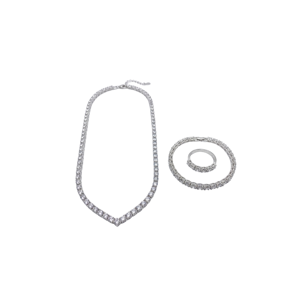 Bu set, düğün şıklığınızı tamamlamak için ihtiyacınız olan her şeyi sunar. V-kesim muazzam kolye, bileğinizi zarifçe saran uyumlu su yolu bileklik ve bu ihtişamı parmağınızda tamamlayan şık yüzük… Parçaların birbiriyle olan mükemmel geometrik uyumu, stilinizde bütüncül bir lüks algısı yaratır. Sadece düğününüzde değil, hayatınızdaki tüm özel davetlerde ve gecelerde size eşlik edecek, modası asla geçmeyecek bir tasarımdır.