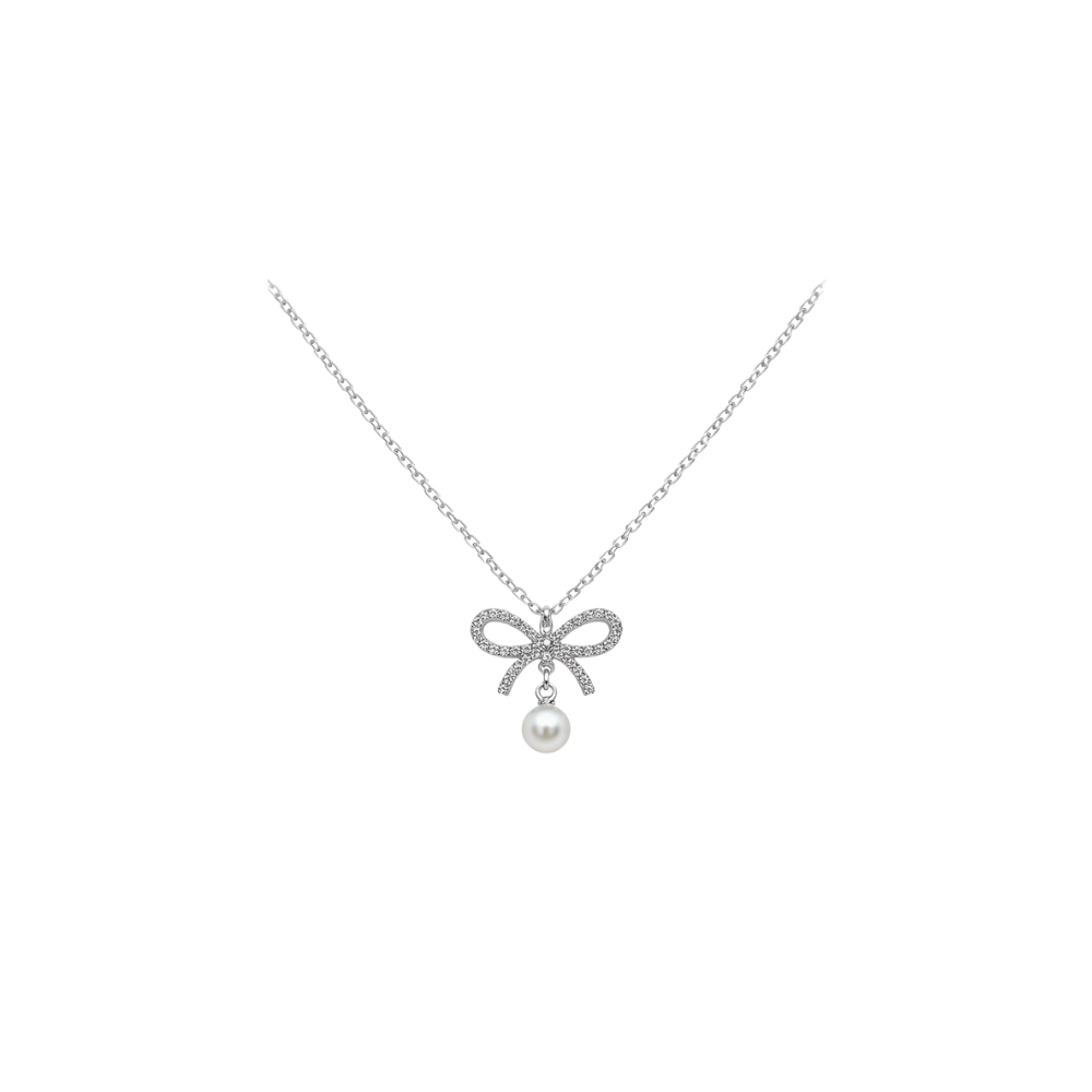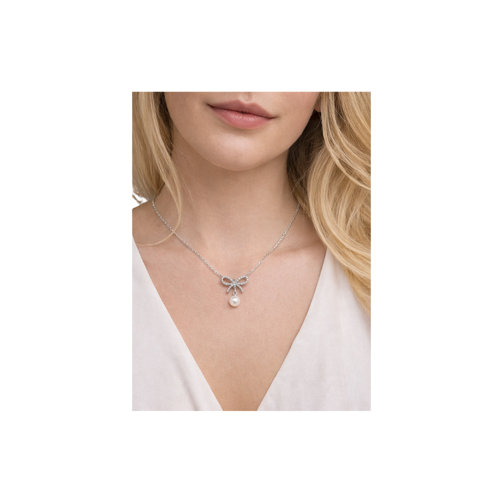 Kolyenin merkezindeki fiyonk motifi, modern kadının hem güçlü hem de zarif yanını temsil ediyor. Işığı her açıdan yansıtan mikro zirkonyum taşlar, en sade kıyafetlerinizi bile anında sofistike bir seviyeye taşıyacak kadar iddialı. Fiyonkun hemen altında sallanan damla/yuvarlak formlu inci, her hareketinizle birlikte nazikçe dans ederek yüzünüze doğal bir aydınlık katıyor.